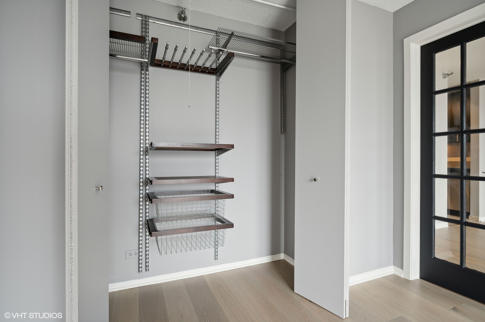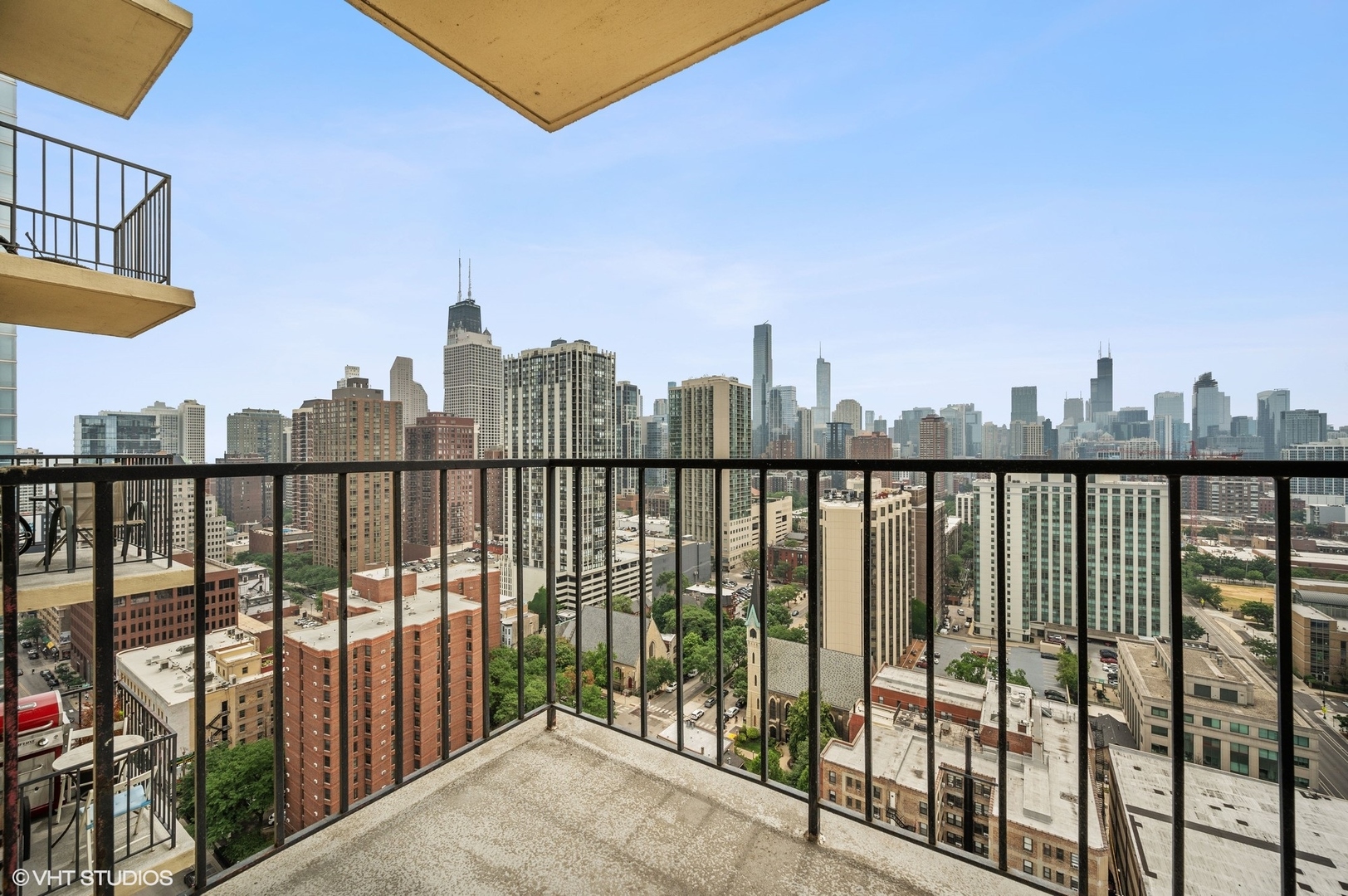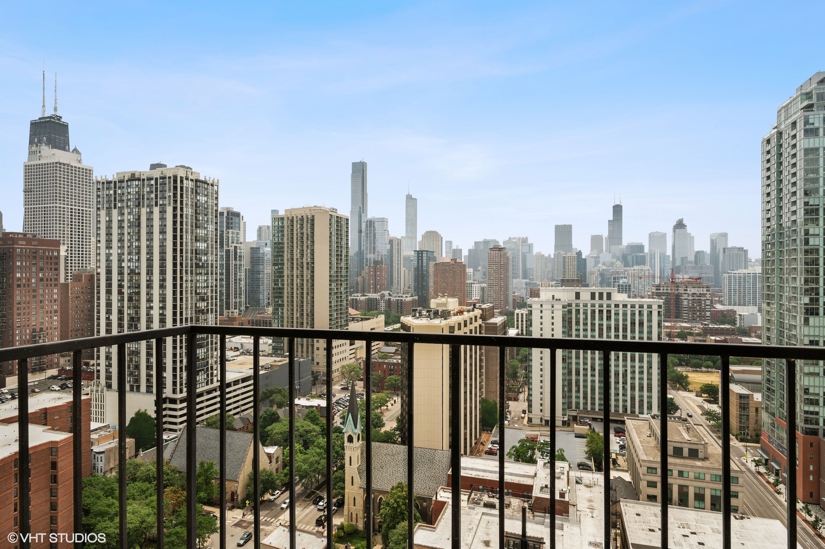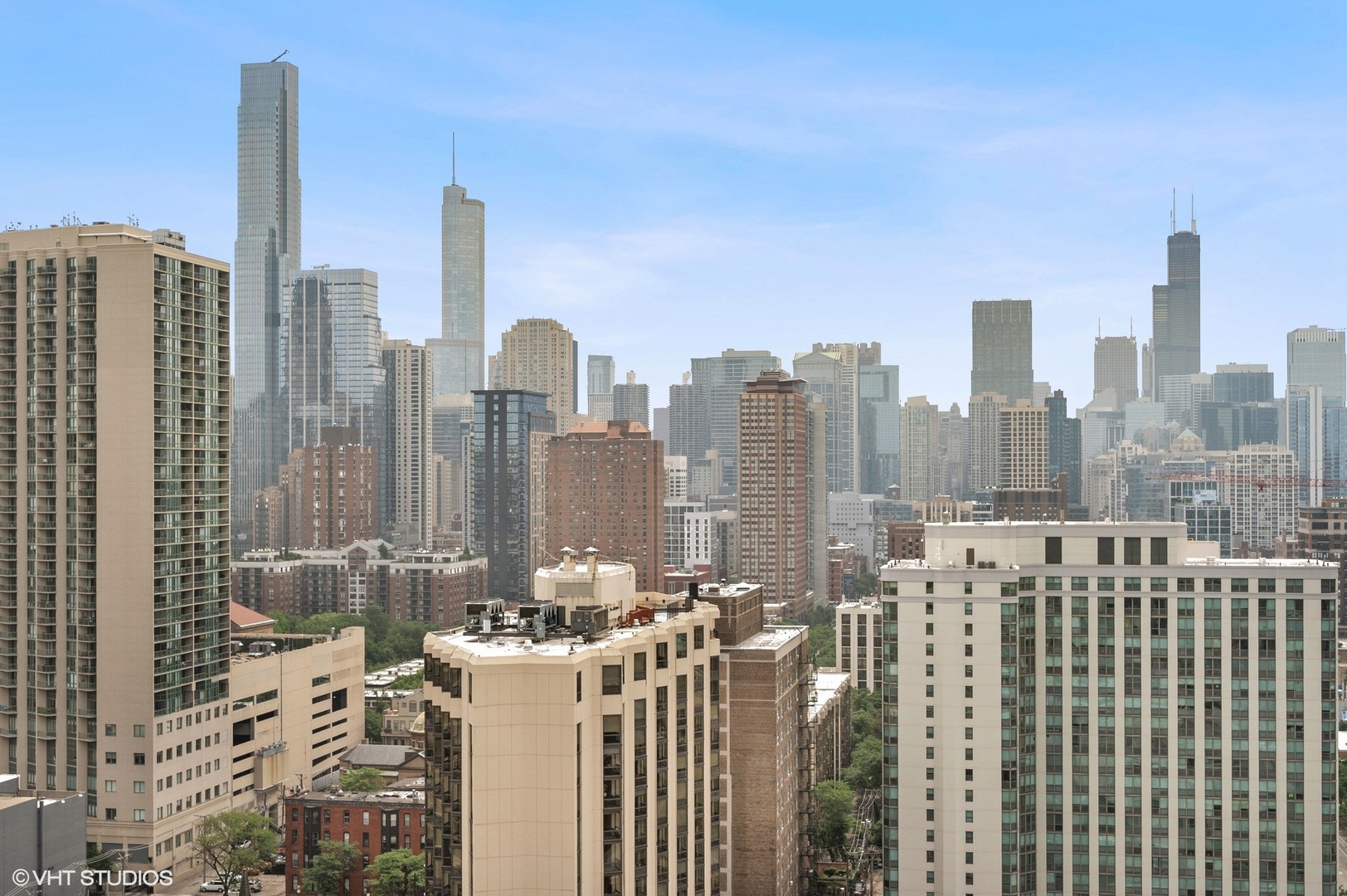 Gorgeous skyline views from this SOUTH-FACING high, 25th, floor 1 bedroom condo at the LaSalle Private Residences! Brand new, beautiful wood flooring and fresh paint as of July 2022! Very efficiently laid out space works great for working from home and/or commuting with the convenient CTA options right outside the door. Modern kitchen has modern rifted white oak cabinets with espresso finish, open shelving with accent lighting, and beautiful granite countertops. Large bedroom space with French doors has room for a desk and dresser. Great closet/storage space throughout the unit. Private balcony - gas grills ok! Unbeatable Old Town/Gold Coast location - steps to Wells St, Division, and Oak/Rush. Red Line and LaSalle bus right outside the door - quick walk/jog to lake front path. Building has a welcoming circle drive for easy pick-ups/drop-offs and deliveries. 24/7 door staff - the best in town! ASSESSMENT INCLUDES HD/DVR, Internet, heat, and AC in addition to the basics. Healthy association with just about $1mil in reserves. Rentals ok. Prime deeded garage parking space with no car neighbors additional $20,000.