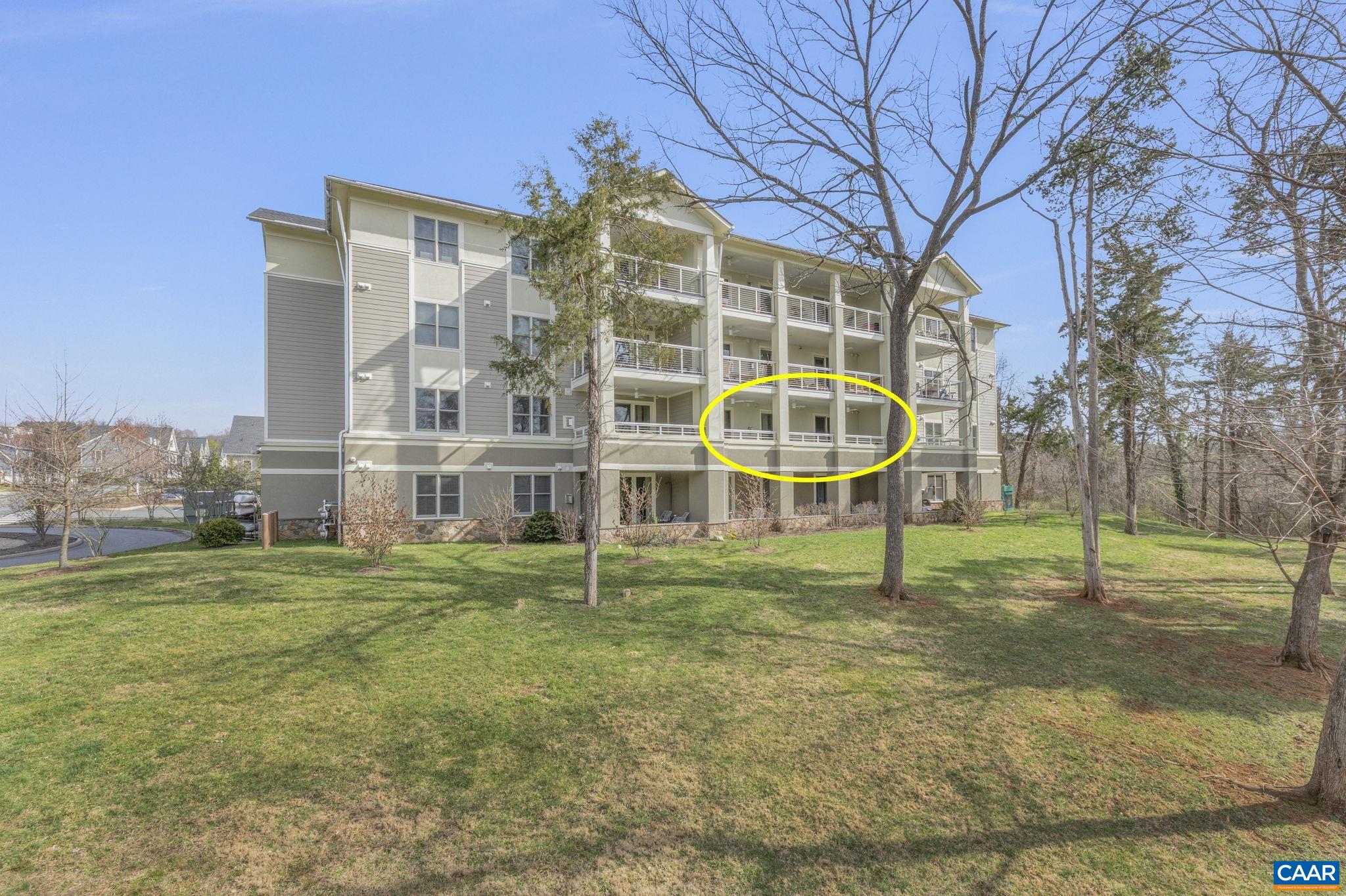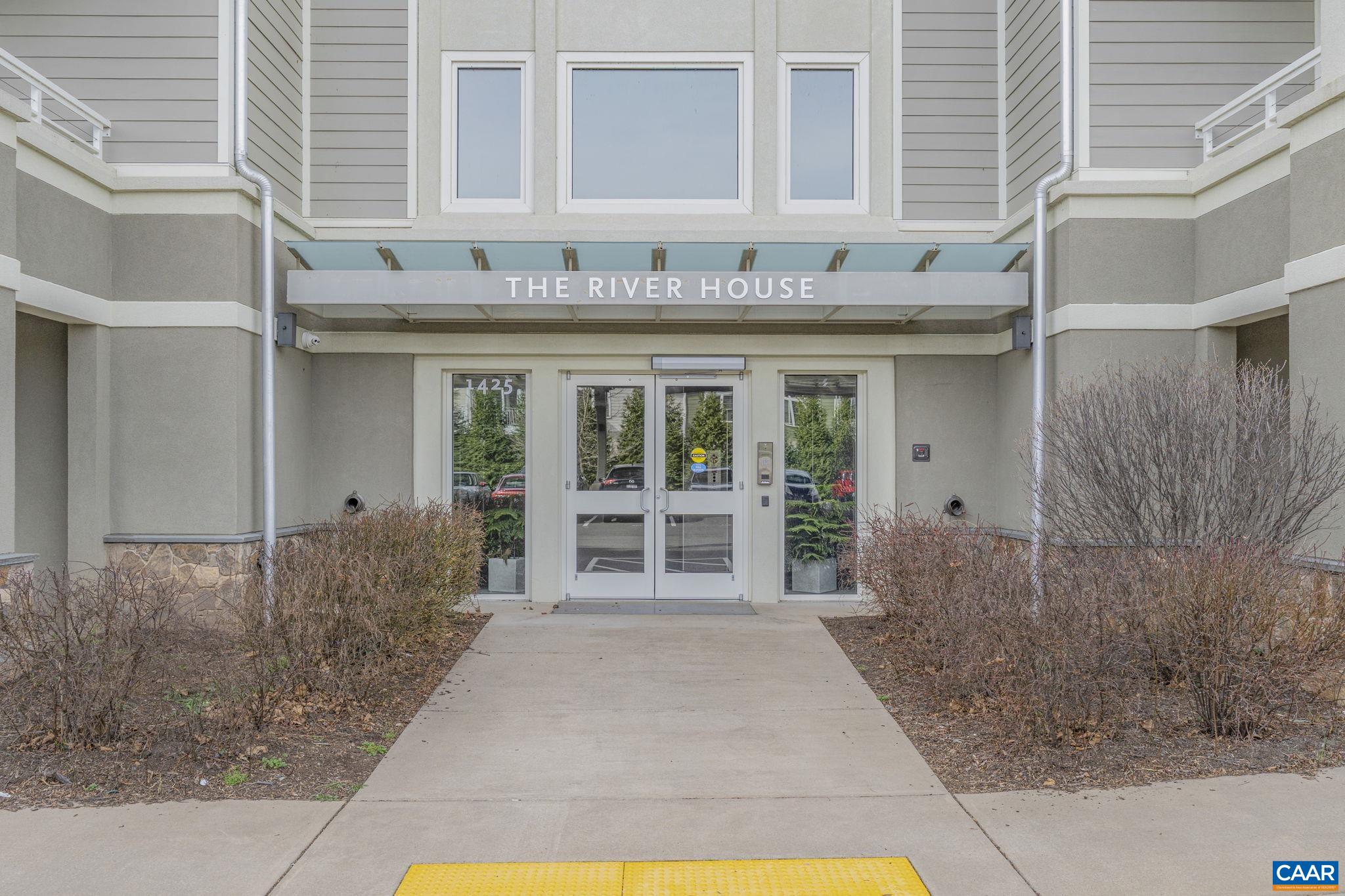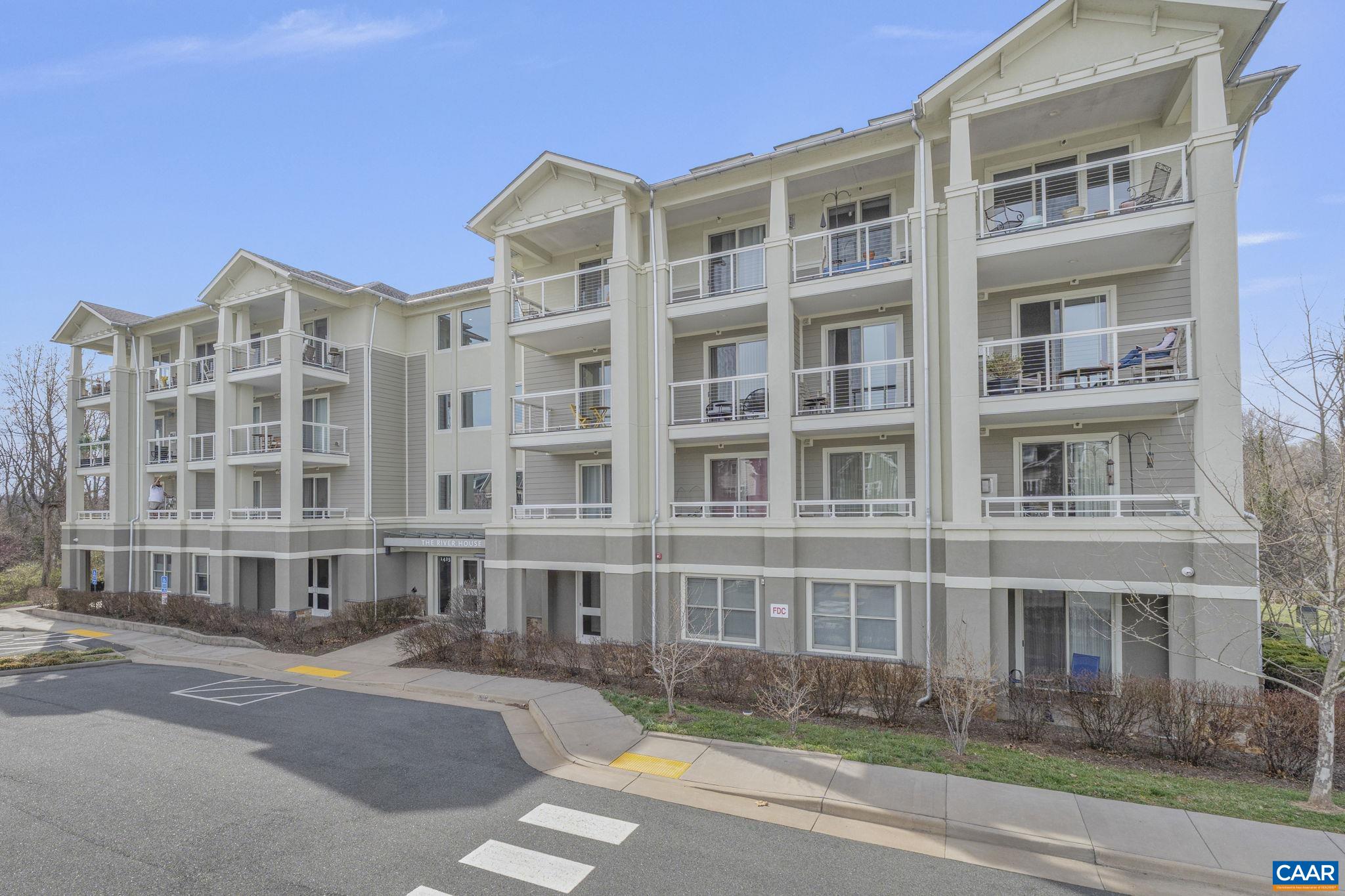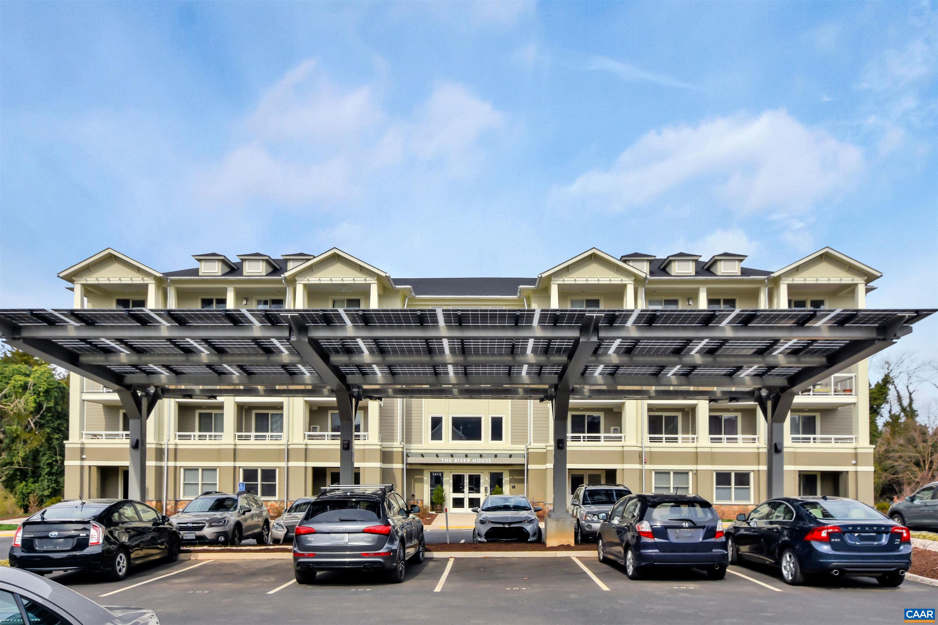 Welcome to this stunning 2-bed, 2-bath condo in The River House Condos at Riverside Village, offering over 1,100 sq ft in an elevator building, this home boasts a rare, oversized covered terrace with views of the scenic Rivanna River. Step inside to find tall ceilings, rich wood floors, and abundant natural light. The stylish and highly functional kitchen features granite countertops, a spacious island with a breakfast bar, and gas cooking. The living room is warm and inviting, with a stone-detailed gas fireplace, built-in shelving, and direct access to the terrace--perfect for seamless indoor-outdoor living. The primary suite is a private retreat, complete with terrace access, a generous walk-in closet and a beautifully appointed bath with a double vanity and a walk-in shower. The second bedroom is equally spacious, with its own access to the terrace. A convenient in-unit front-load stacked washer and dryer add to the ease of everyday living. Energy-efficient home is EarthCraft-certified, offering keyless entry security, a fitness room, and fire pit. A solar canopy provides 1 covered parking space, wired for electric vehicle charging. An additional exterior parking space and guest parking is available