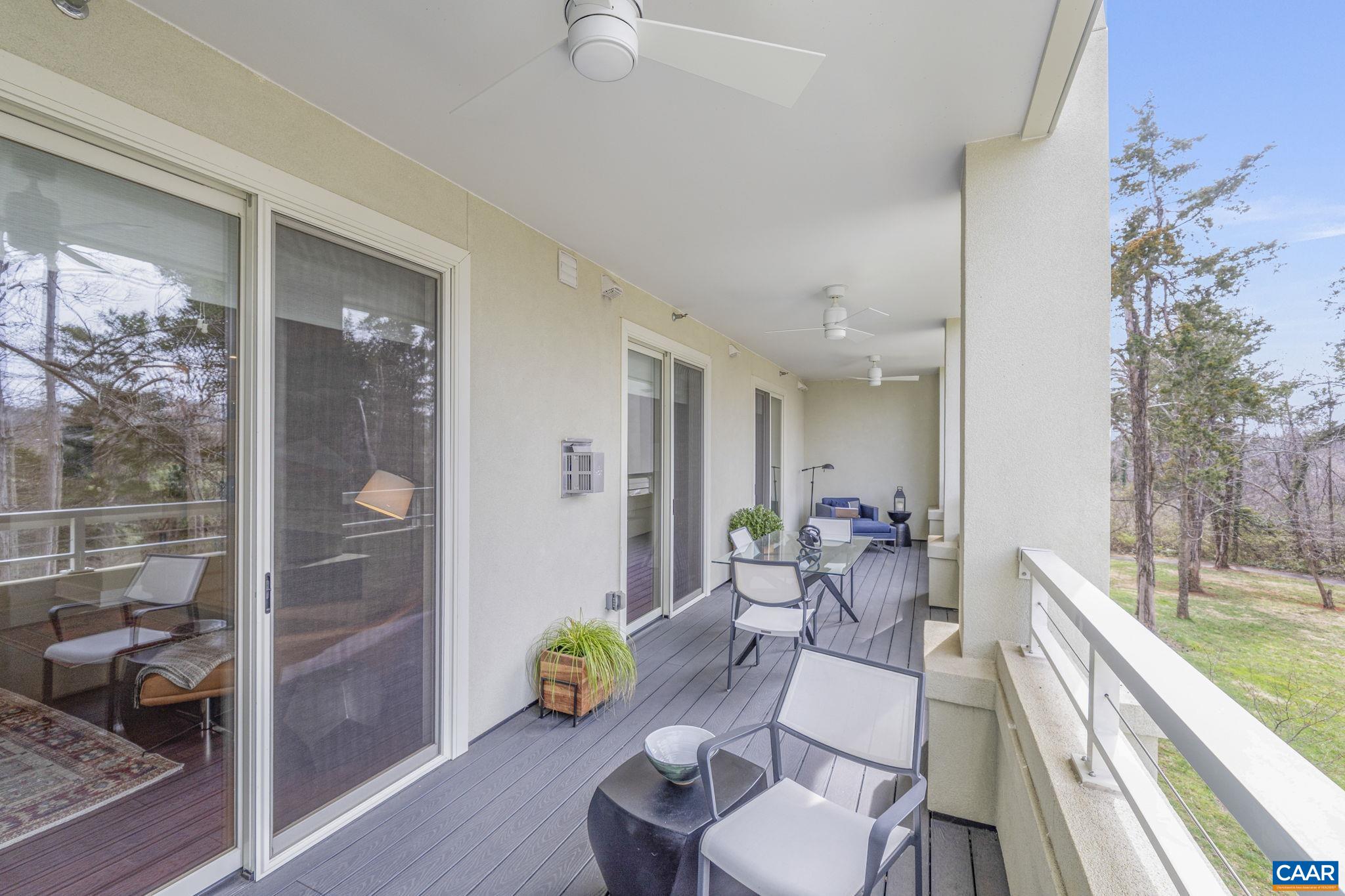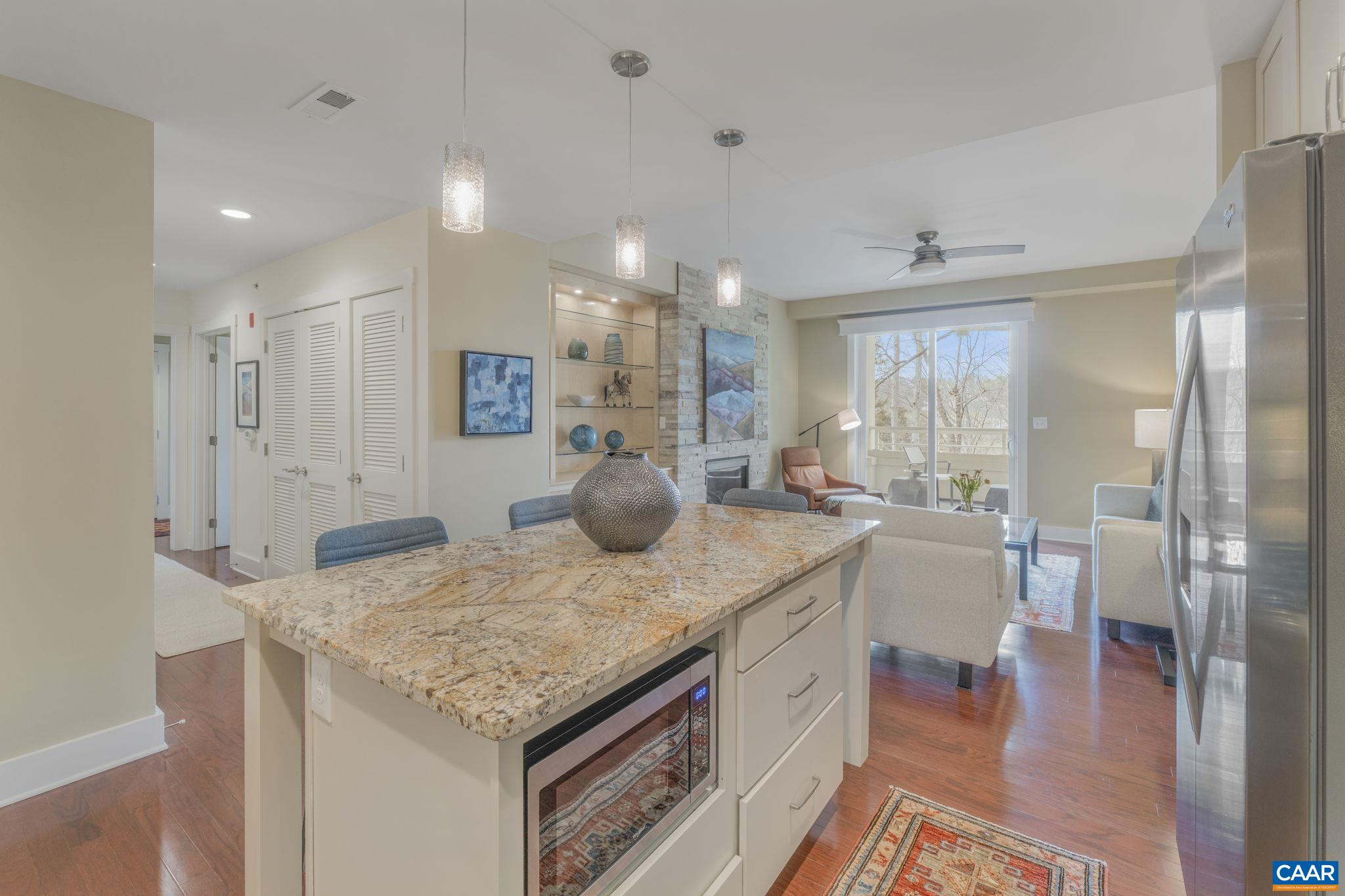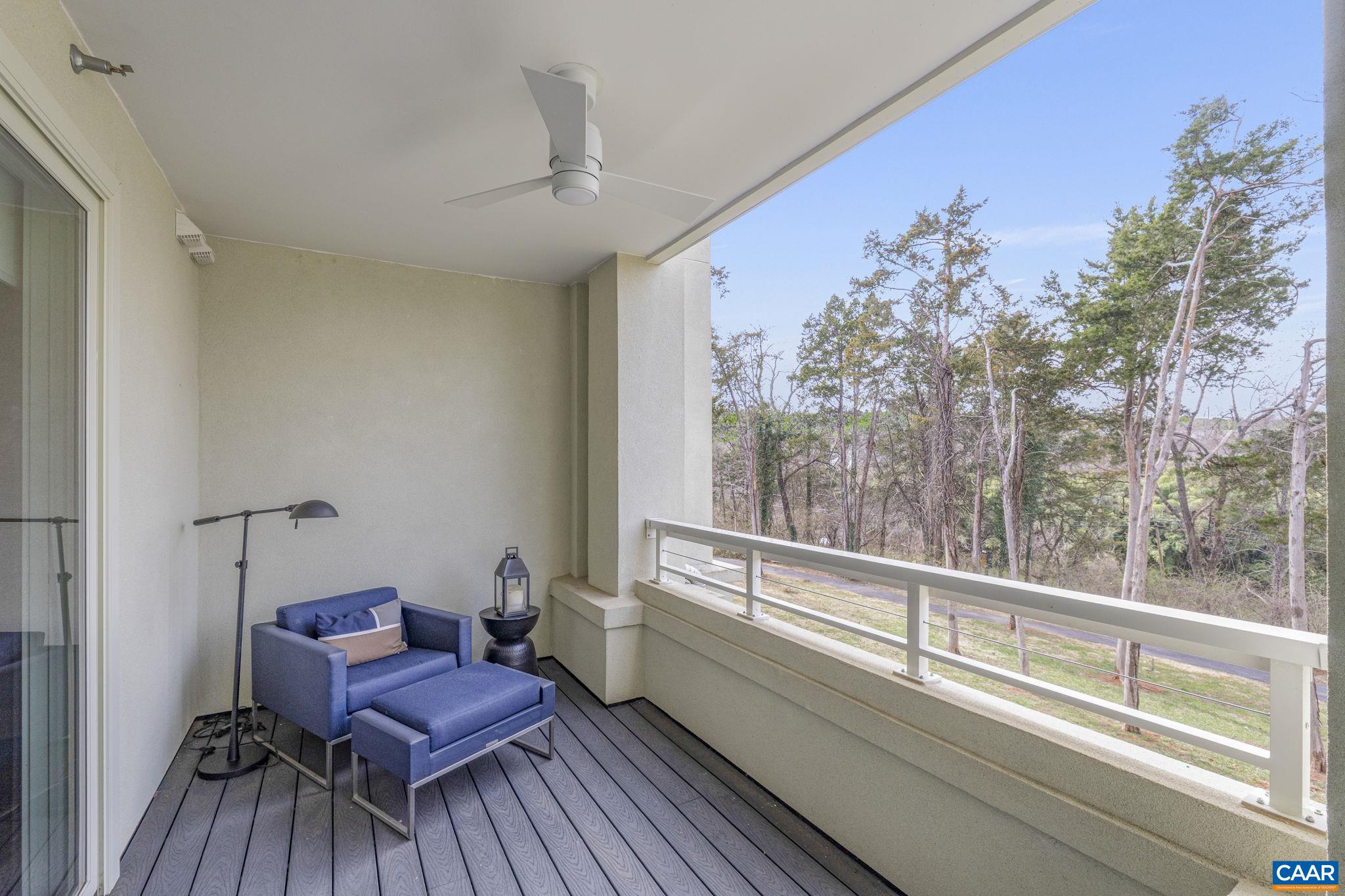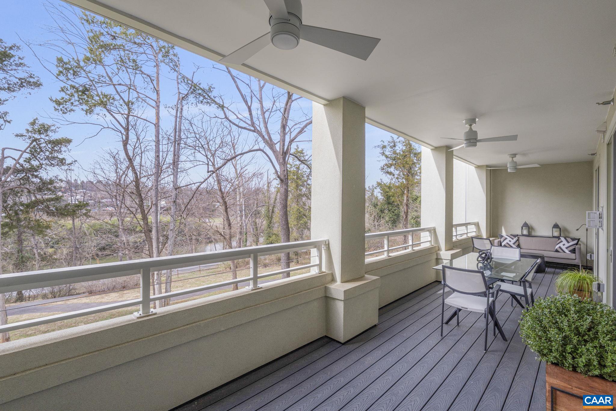 Welcome to this stunning 2-bed, 2-bath condo in The River House Condos at Riverside Village, offering over 1,100 sq ft in an elevator building, this home boasts a rare, oversized covered terrace with views of the scenic Rivanna River. Step inside to find tall ceilings, rich wood floors, and abundant natural light. The stylish and highly functional kitchen features granite countertops, a spacious island with a breakfast bar, and gas cooking. The living room is warm and inviting, with a stone-detailed gas fireplace, built-in shelving, and direct access to the terrace--perfect for seamless indoor-outdoor living. The primary suite is a private retreat, complete with terrace access, a generous walk-in closet and a beautifully appointed bath with a double vanity and a walk-in shower. The second bedroom is equally spacious, with its own access to the terrace. A convenient in-unit front-load stacked washer and dryer add to the ease of everyday living. Energy-efficient home is EarthCraft-certified, offering keyless entry security, a fitness room, and fire pit. A solar canopy provides 1 covered parking space, wired for electric vehicle charging. An additional exterior parking space and guest parking is available