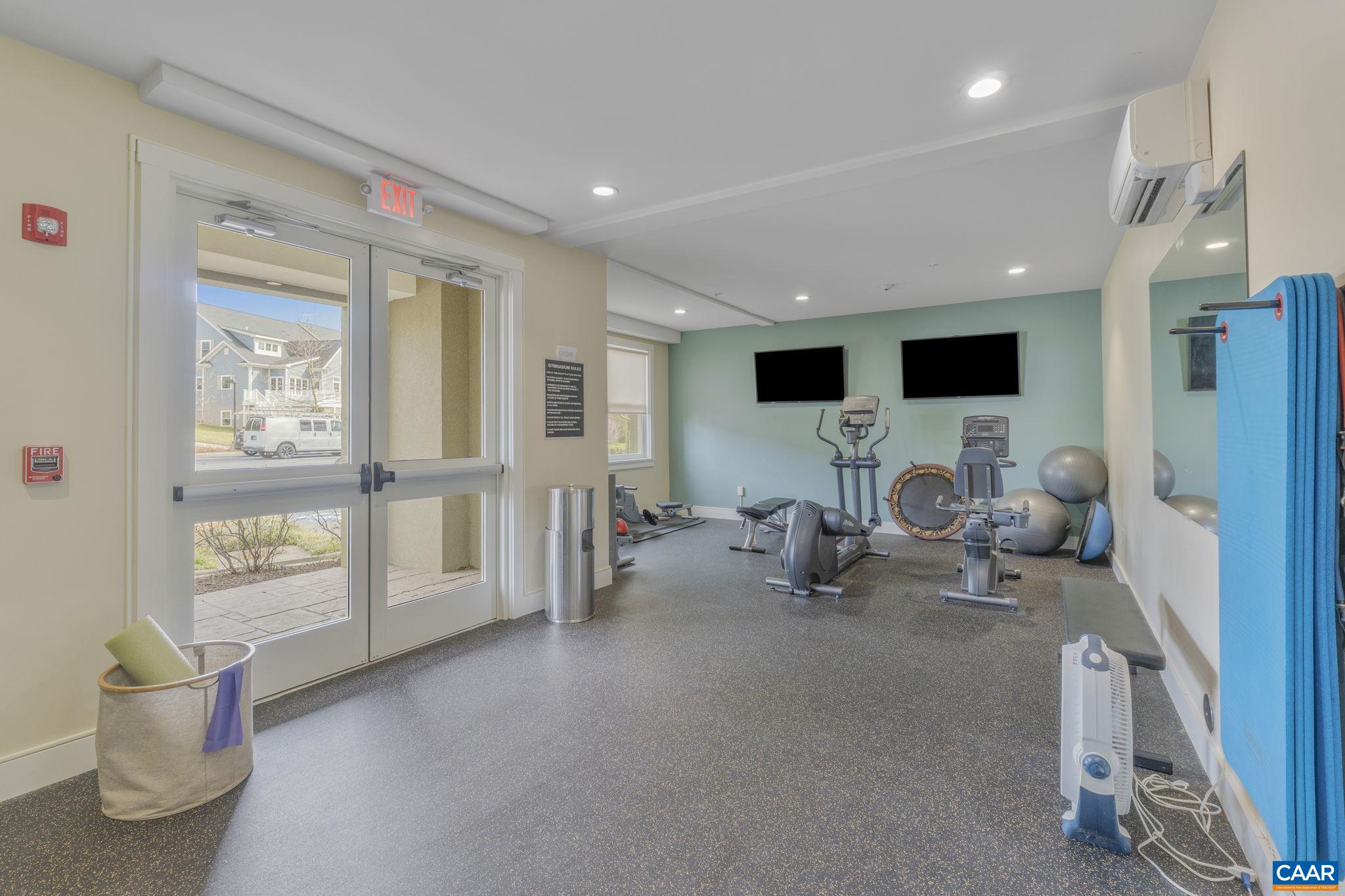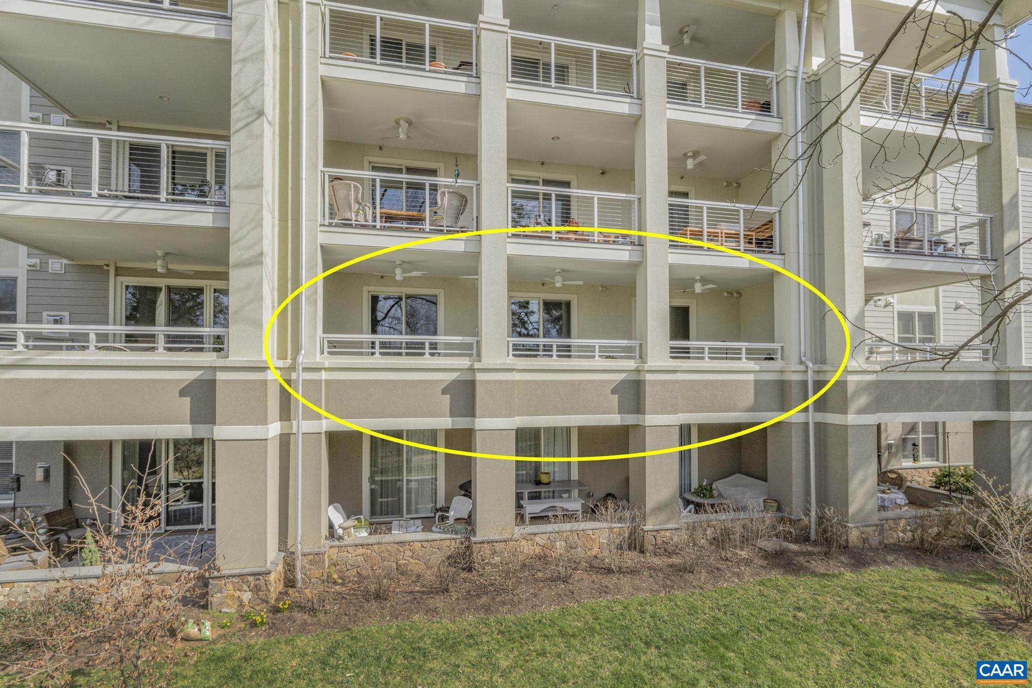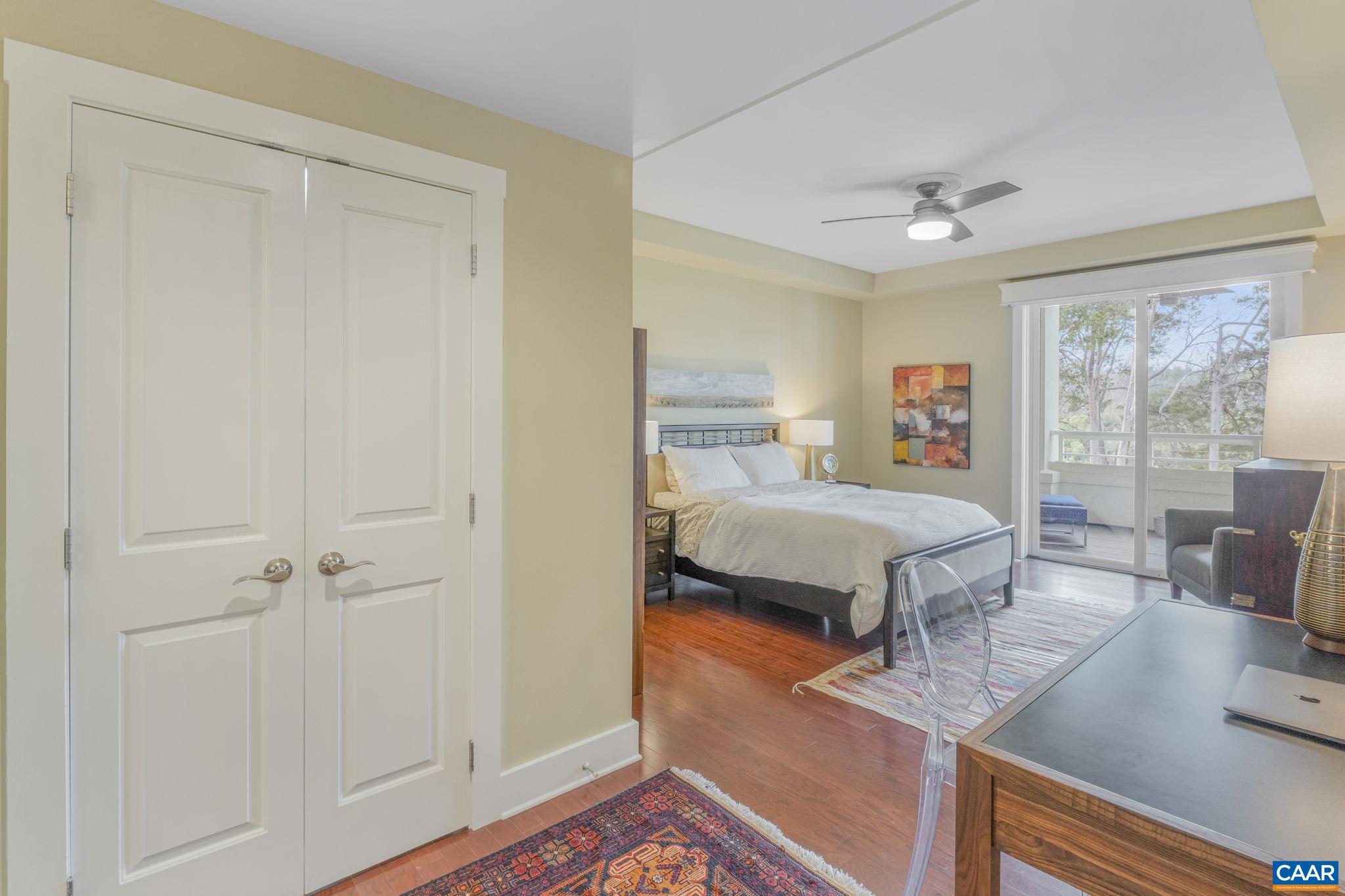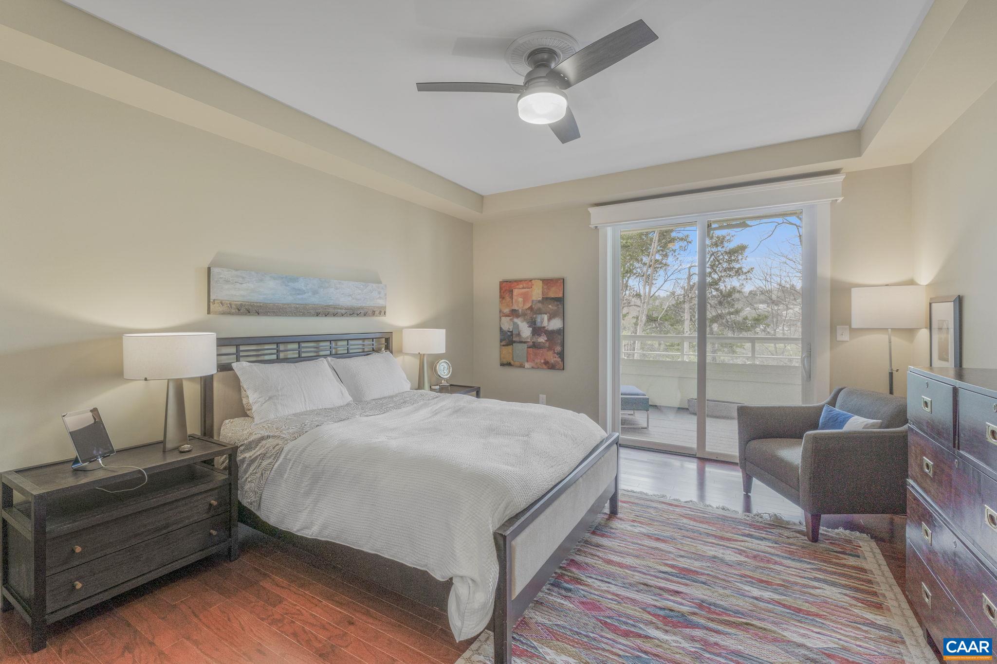 Welcome to this stunning 2-bed, 2-bath condo in The River House Condos at Riverside Village, offering over 1,100 sq ft in an elevator building, this home boasts a rare, oversized covered terrace with views of the scenic Rivanna River. Step inside to find tall ceilings, rich wood floors, and abundant natural light. The stylish and highly functional kitchen features granite countertops, a spacious island with a breakfast bar, and gas cooking. The living room is warm and inviting, with a stone-detailed gas fireplace, built-in shelving, and direct access to the terrace--perfect for seamless indoor-outdoor living. The primary suite is a private retreat, complete with terrace access, a generous walk-in closet and a beautifully appointed bath with a double vanity and a walk-in shower. The second bedroom is equally spacious, with its own access to the terrace. A convenient in-unit front-load stacked washer and dryer add to the ease of everyday living. Energy-efficient home is EarthCraft-certified, offering keyless entry security, a fitness room, and fire pit. A solar canopy provides 1 covered parking space, wired for electric vehicle charging. An additional exterior parking space and guest parking is available