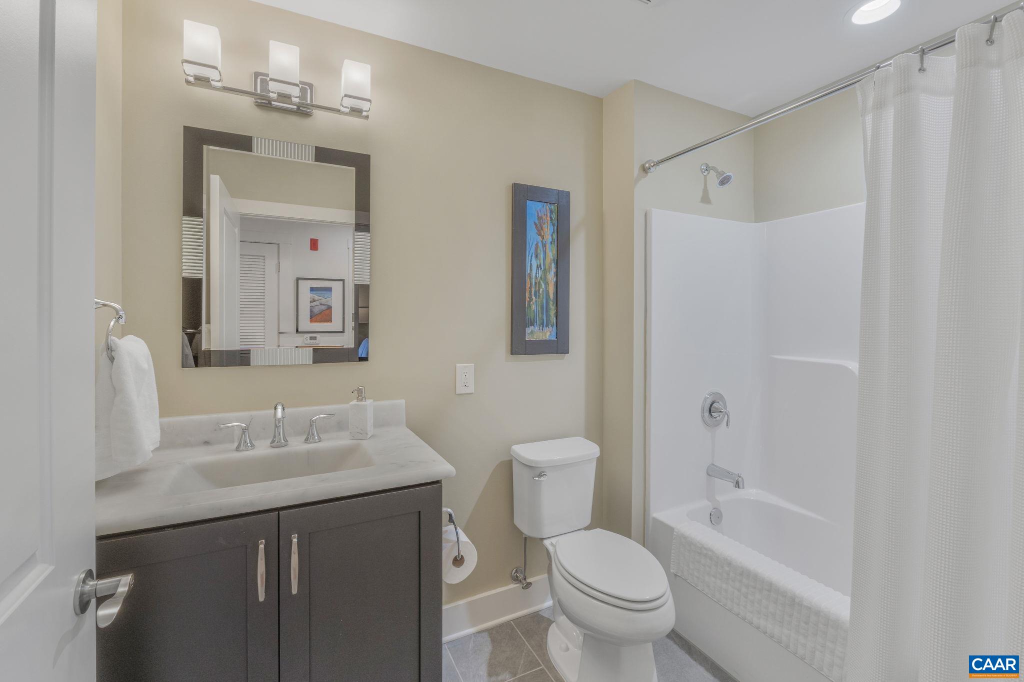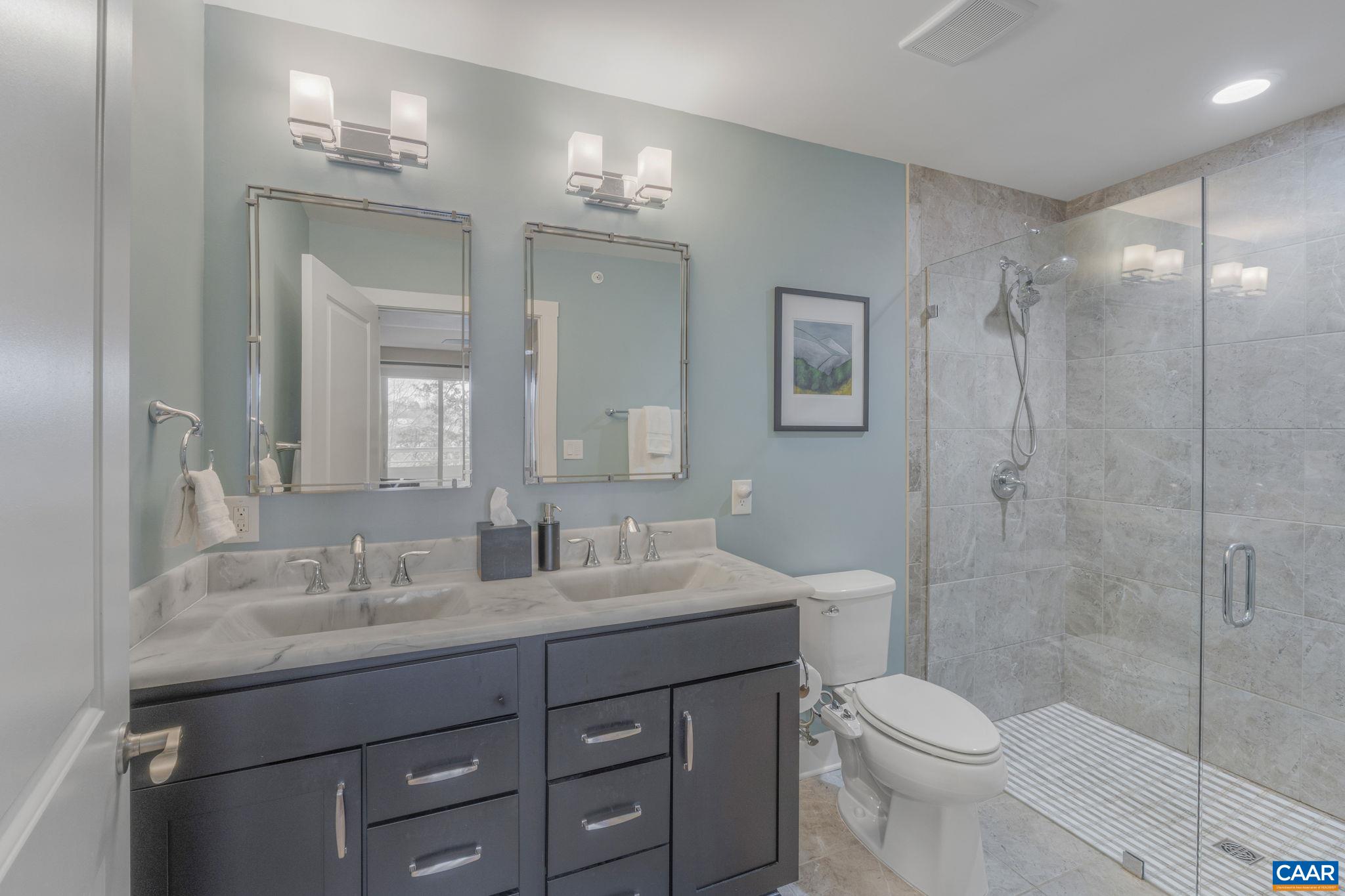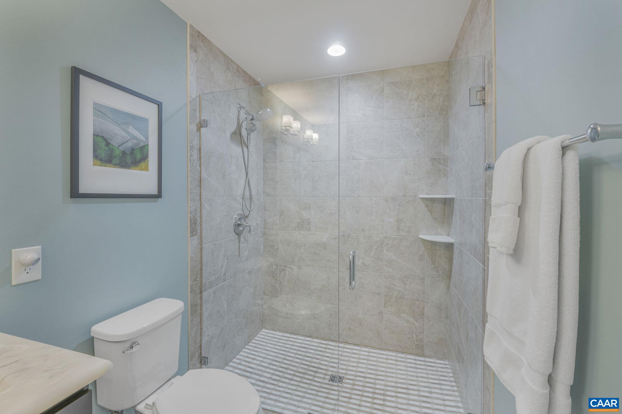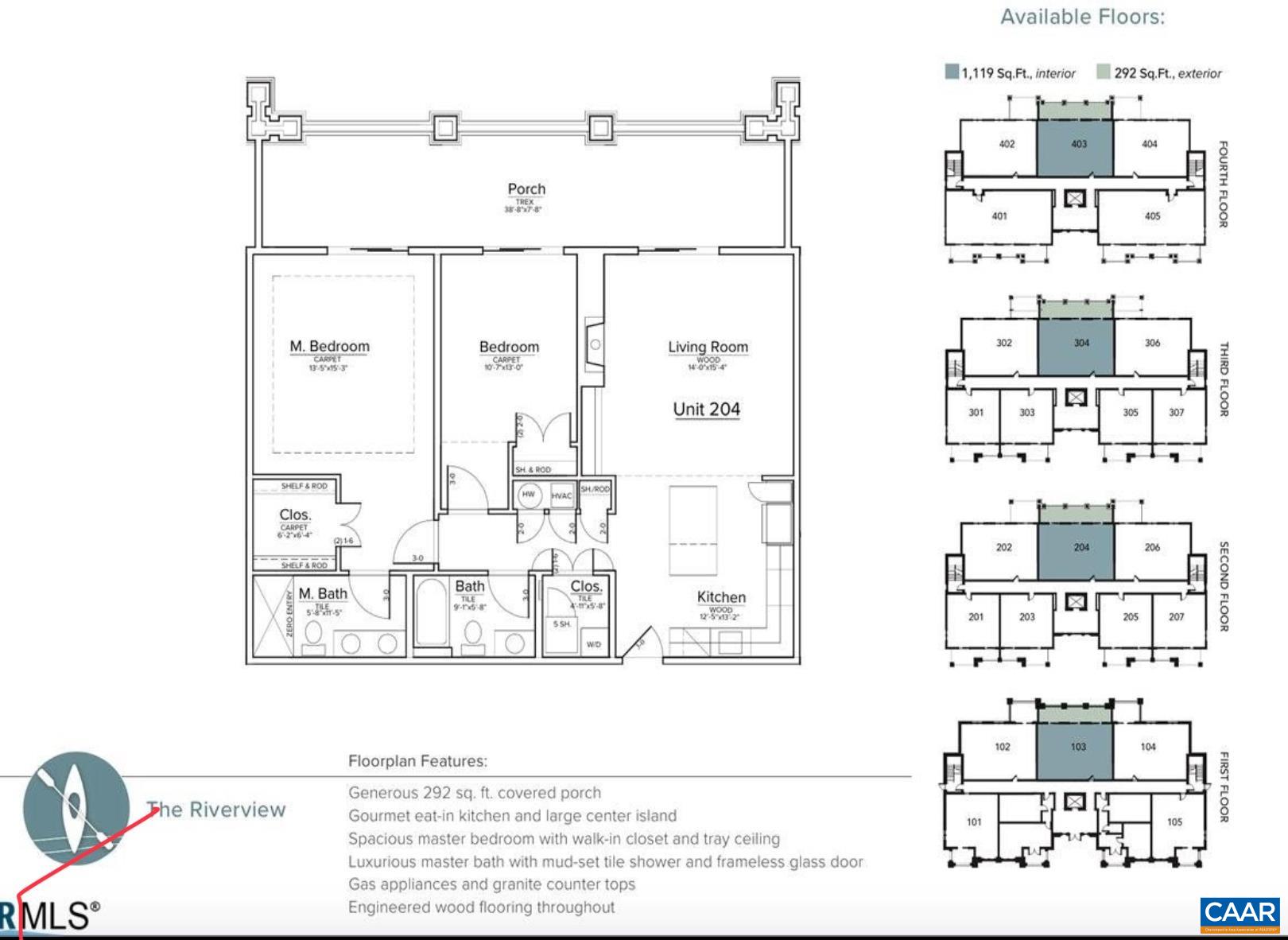 Welcome to this stunning 2-bed, 2-bath condo in The River House Condos at Riverside Village, offering over 1,100 sq ft in an elevator building, this home boasts a rare, oversized covered terrace with views of the scenic Rivanna River. Step inside to find tall ceilings, rich wood floors, and abundant natural light. The stylish and highly functional kitchen features granite countertops, a spacious island with a breakfast bar, and gas cooking. The living room is warm and inviting, with a stone-detailed gas fireplace, built-in shelving, and direct access to the terrace--perfect for seamless indoor-outdoor living. The primary suite is a private retreat, complete with terrace access, a generous walk-in closet and a beautifully appointed bath with a double vanity and a walk-in shower. The second bedroom is equally spacious, with its own access to the terrace. A convenient in-unit front-load stacked washer and dryer add to the ease of everyday living. Energy-efficient home is EarthCraft-certified, offering keyless entry security, a fitness room, and fire pit. A solar canopy provides 1 covered parking space, wired for electric vehicle charging. An additional exterior parking space and guest parking is available