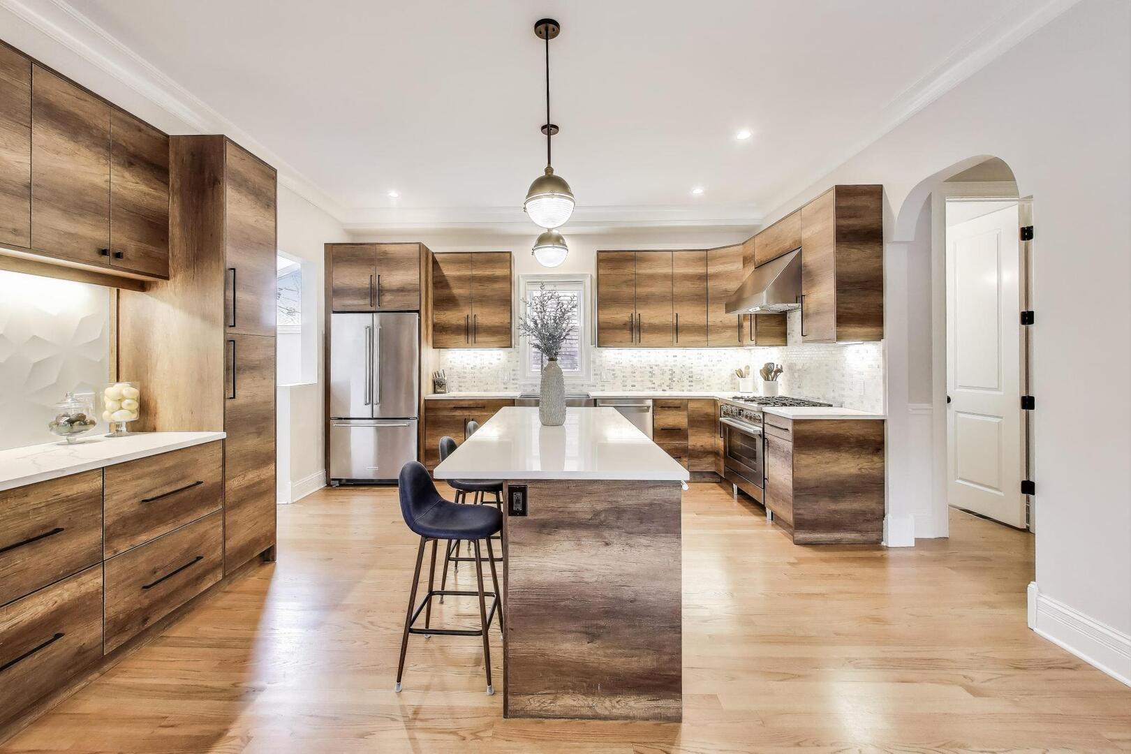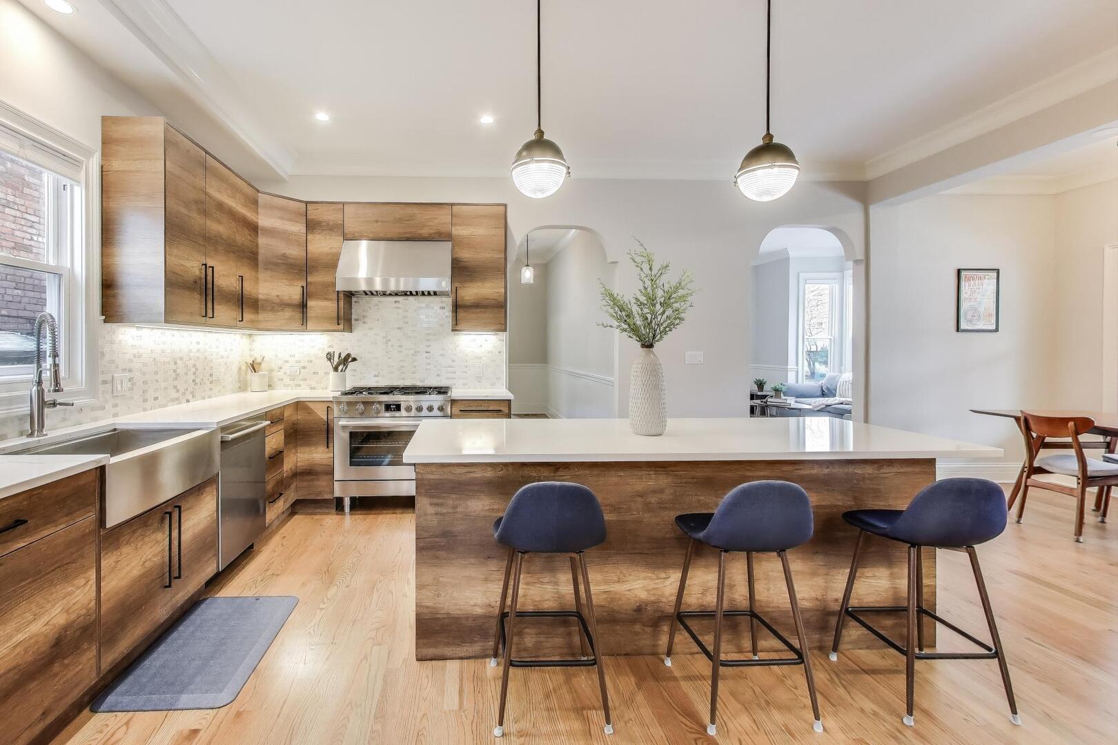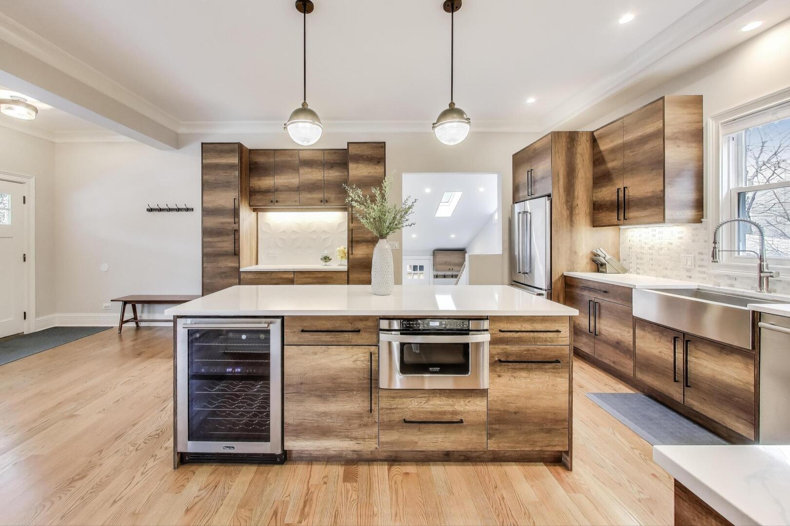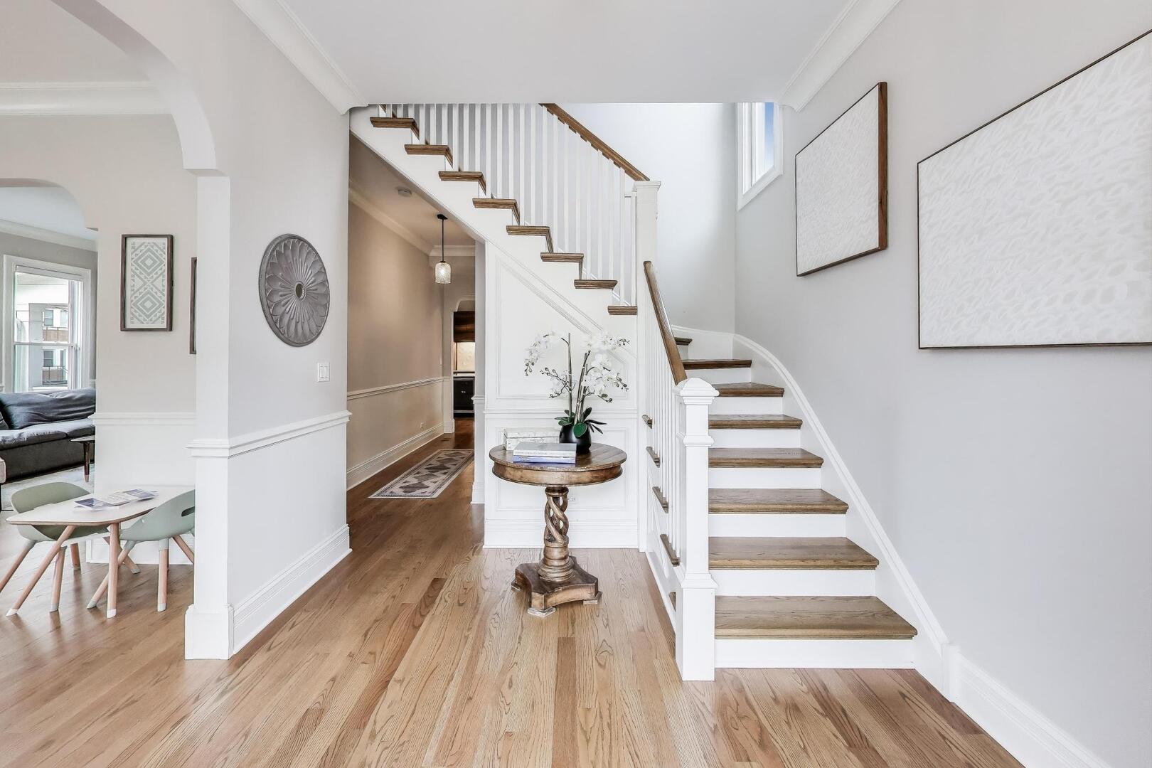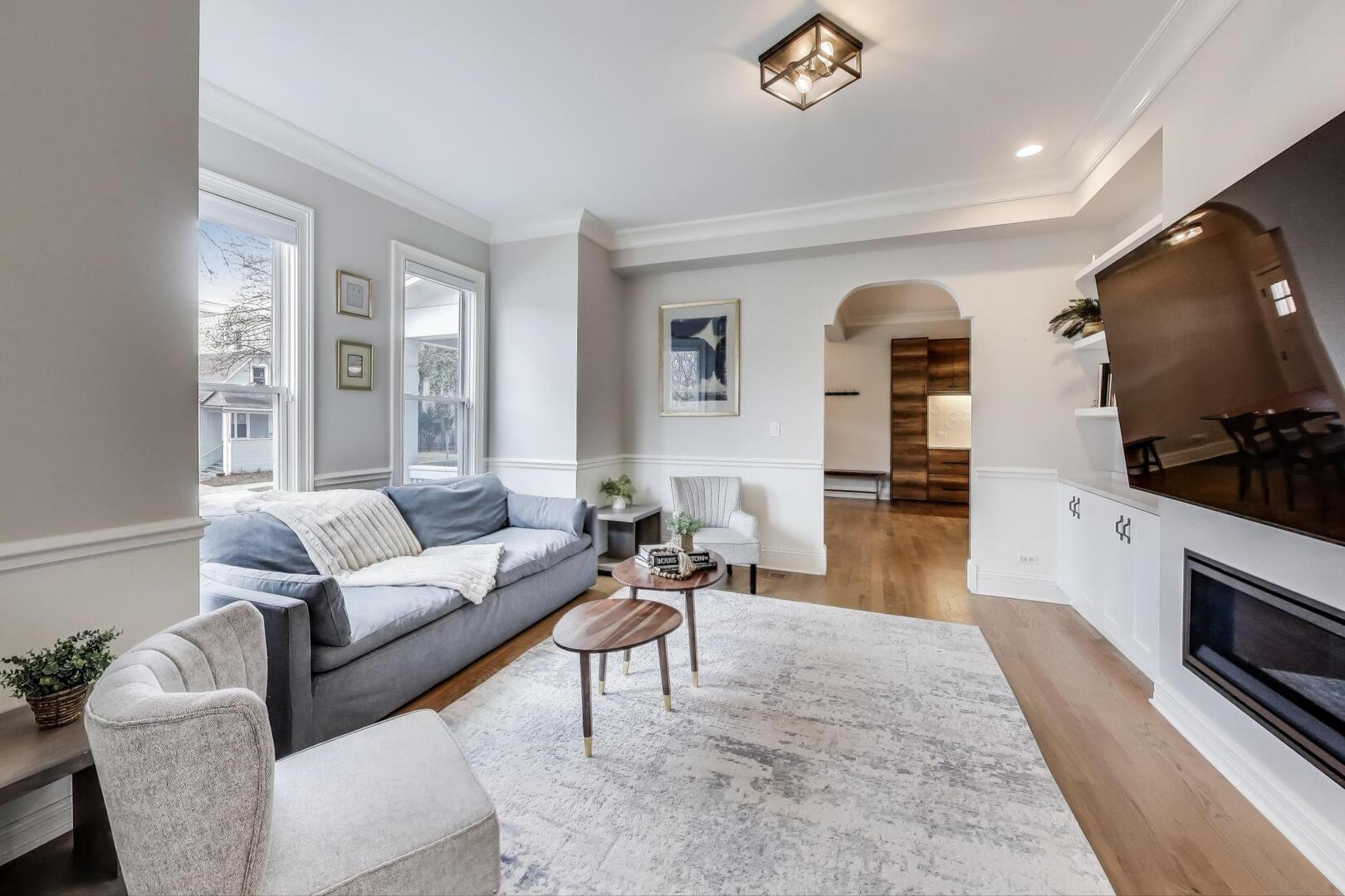 Beautiful fully-restored Victorian in the Frank Lloyd Wright Historical District, a location that cannot be beat - just steps to all the best Oak Park shopping, dining, parks and public transit. This masterpiece was completely updated four years ago with all new plumbing, electrical, HVAC, windows, insulation, and so many beautiful modern finishes all while keeping its historical charm including unique archways and hand carvings. Gorgeous red oak floors span throughout the main level and upstairs. No details were missed in the enormous kitchen featuring soft-close cabinetry, Quartz countertops, tile backsplash, large built-in pantry/coffee bar, wine fridge, and spacious eat-in dining space. The family room features built in cabinets and storage in addition to a cozy gas fireplace. A formal living/flex area, half bath and organized laundry room complete the first level. The upstairs features 4 bedrooms, all on the same level including the beautiful primary suite with walk in organized closet system, ensuite bath with double sinks and thoughtful tile choices. The 1,300+ sq ft finished lower level is the perfect in-law suite and entertainment area with a large wet bar, beverage fridge, full bath, and several storage areas including a second laundry hook-up. Enjoy the convenience of an attached 2-car garage, a rare find in the area, just off of the mud room with a bright skylight, and two HVAC systems with Nest thermostats. Large fenced in yard with cozy deck and dog run on a corner lot. Nothing to do except move right into this perfect home and take advantage of all that Oak Park has to offer at your fingertips.