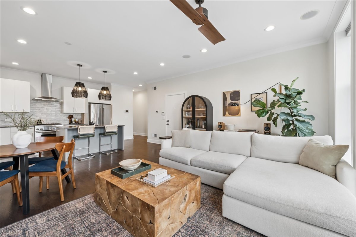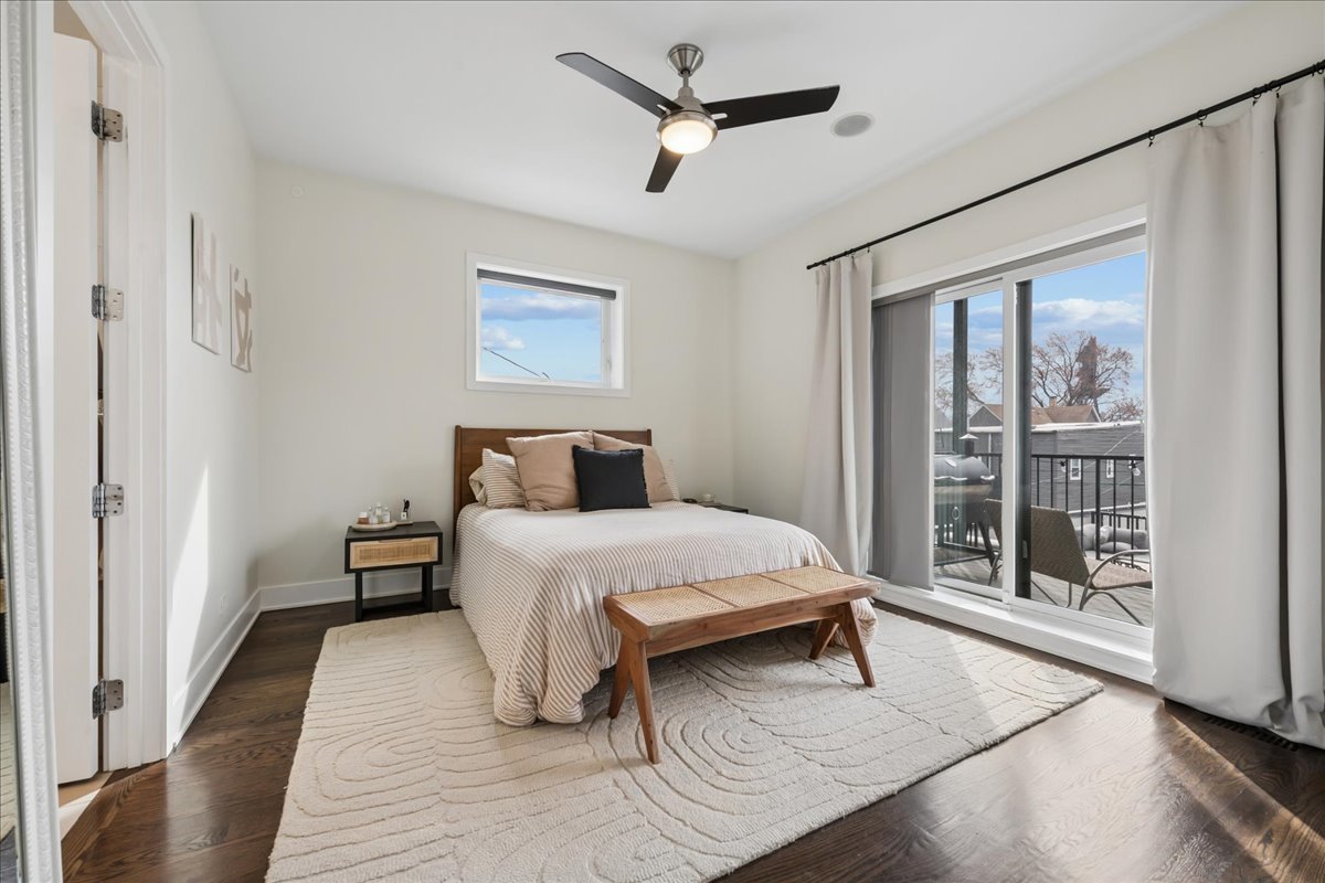 Discover modern city living in this beautifully maintained 2018-built 3-bedroom, 2-bathroom condo in the heart of Avondale, featuring an exclusive private rooftop deck with skyline views. Step inside to an open, light-filled floor plan showcasing 10-foot ceilings, solid core doors, and hardwood floors throughout. The chef's kitchen is built to entertain, equipped with 42-inch white cabinetry, quartz countertops, a large prep island, and high-end stainless steel appliances. The kitchen flows seamlessly into a spacious living and dining area anchored by a sleek glass gas fireplace and massive floor-to-ceiling windows. The primary suite serves as a quiet retreat, offering custom-outfitted closets and a luxurious en-suite bath complete with a double vanity, heated floors, and an oversized glass walk-in shower. Two additional well-sized bedrooms share a beautifully appointed second full bathroom, providing excellent flexibility for guests or a dedicated home office. Thoughtful smart home technology and premium upgrades are integrated throughout, including an on-demand tankless water heater, Nest thermostat, August smart lock, video intercom touchpad, and built-in surround sound speakers-which extend right up to your private roof deck. Complete with in-unit side-by-side laundry, secured garage parking, and additional private storage space. Situated in a 5/6 owner-occupied building with strong reserves, this home offers unbeatable walkability to Avondale's best dining and nightlife, the 312 River Run, the CTA Blue Line, and highly convenient expressway access.